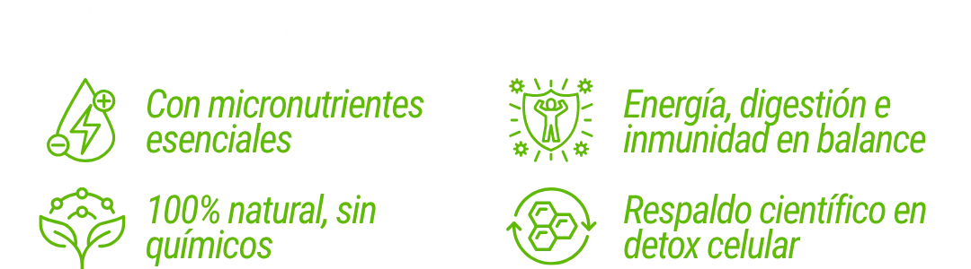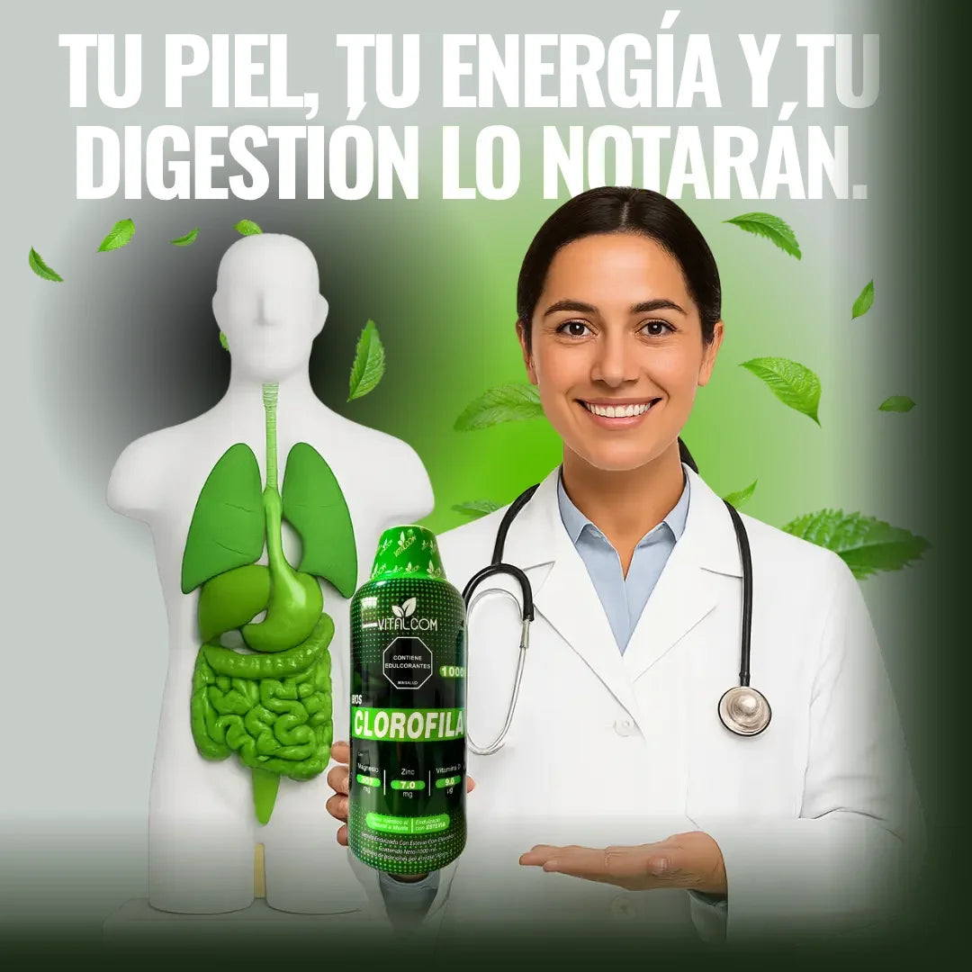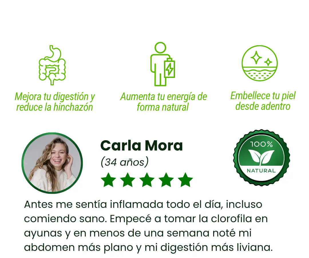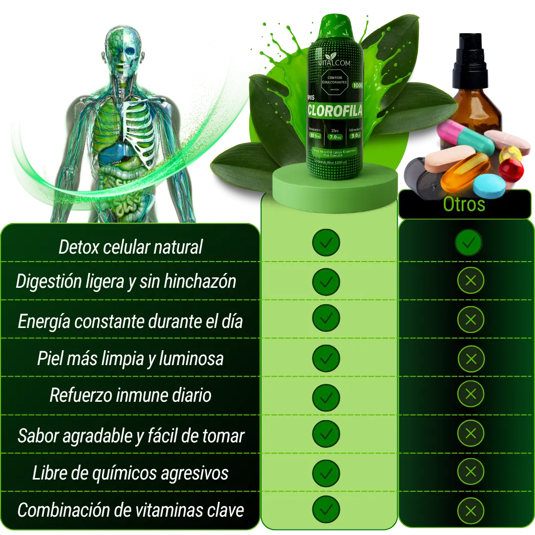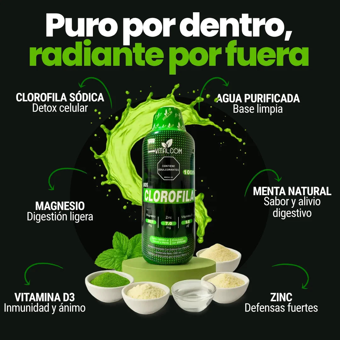 La clorofila actúa como un depurador celular natural:ayuda a eliminar toxinas acumuladas, mejora la oxigenación celular y favorece una digestión más eficiente. Su fórmula potencia la regeneración interna, reduce la inflamación y fortalece el sistema inmune desde adentro.